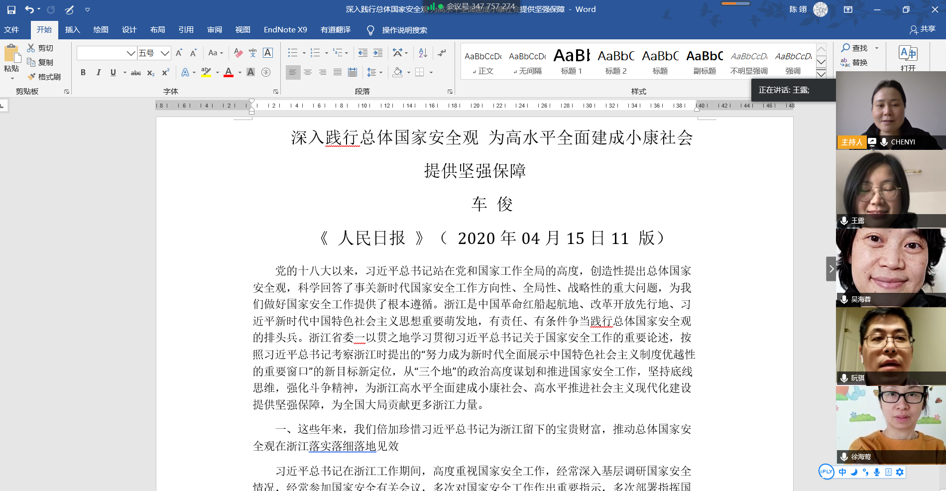 在学习省委书记的讲话后,各位老师都发表了自己的看法。大家纷纷指出,浙江现在是全国各个省份的榜样和样本,特别是应对疫情的种种做法,为老百姓提供了基本的安全保障,大家都为自己身为浙江人感到骄傲,幸福指数非常高。而浙江的公务员也非常辛苦,他们付出了巨大的努力,我们作为教师也必须要全力以赴。身在加拿大的阮骐老师还对比了他所处的加拿大BC省和浙江省得种种做法,表示非常赞同国内的对策,他自己很想回国,但是苦于没有机票。