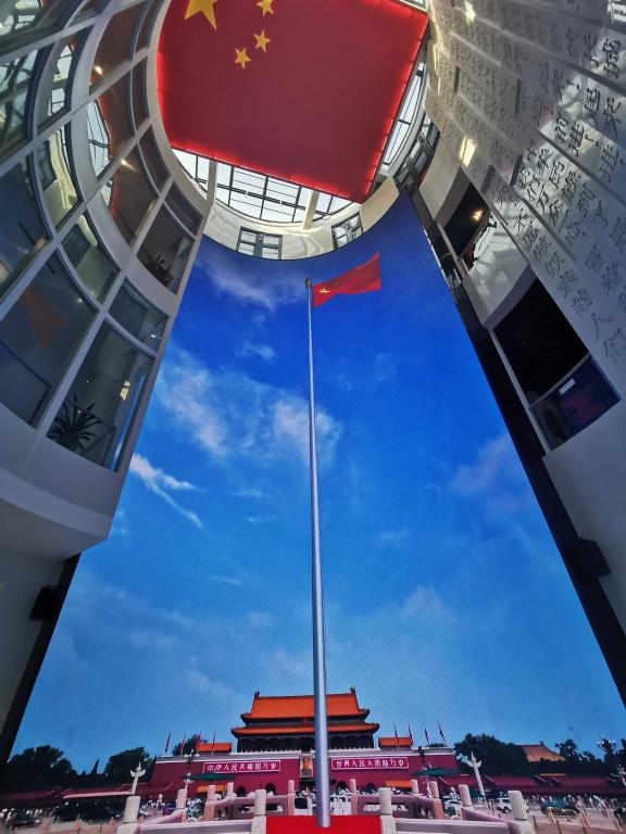国旗教育馆位于瑞安西山,以“天圆地方、天瑞地主,鼎盛中华、红旗飘扬”为设计主题,分序厅、尾厅、附属厅和四个主题厅——国旗诞生厅、国旗知识厅、国旗荣耀厅、瑞安发展厅。进入展馆一层,首先映入眼帘的是一巨幅升旗幕屏。伴随着国歌声,党员们在国旗前庄严地行注目礼,体验一次不同意义的升旗仪式。