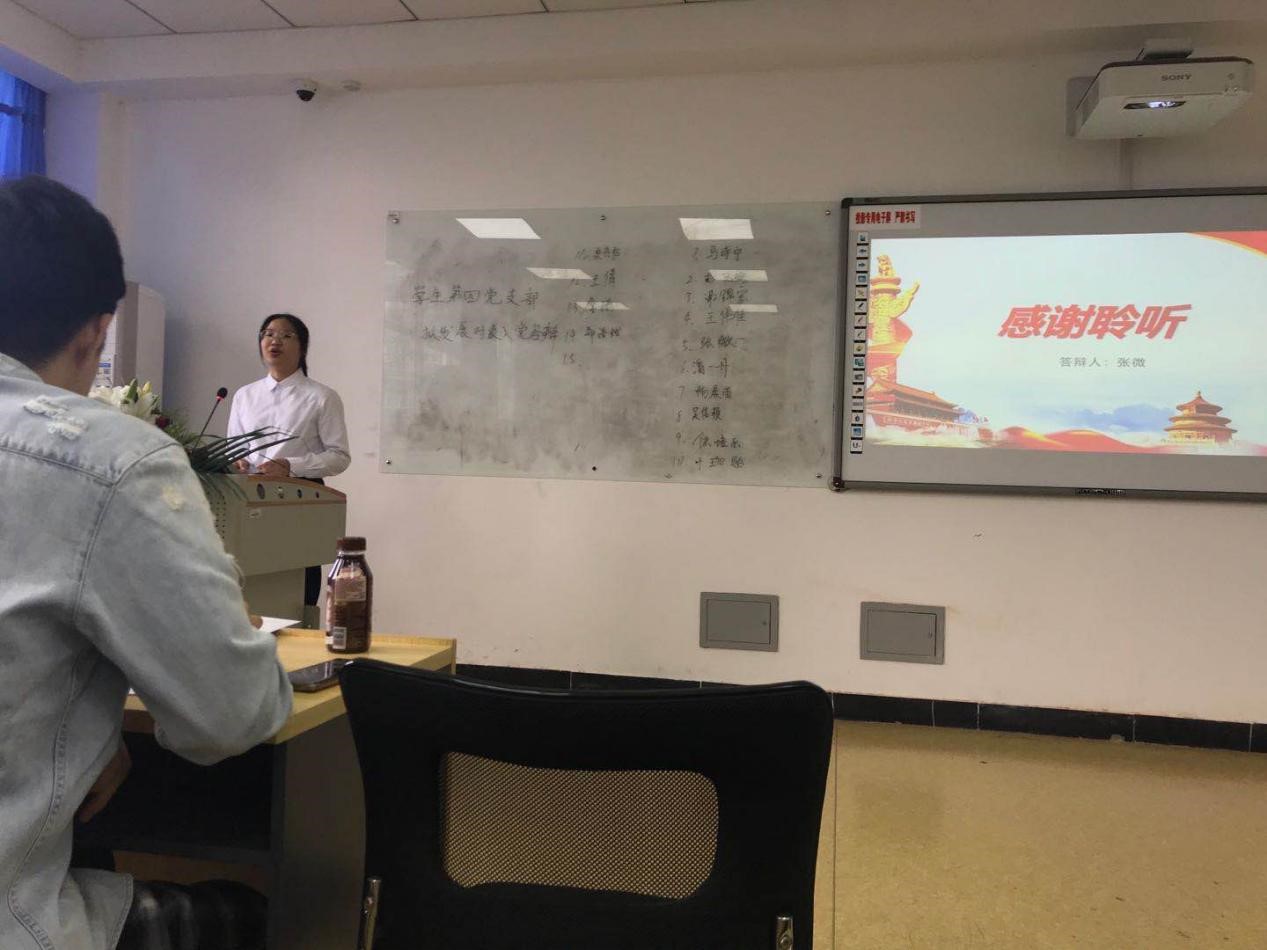 经过前期推优、理论考试、面谈、群众调查等环节,层层考核挑选,最终有十四名入党积极分子进入答辩环节,分别是:王倩、史丹怡、王伟佳、陈培乐、张微、吴佳颖、潘一丹、叶珈贻、郑浩燃、杨晨苗、詹琦、谢锦宏、马诗宁、彭玉寒。本次入党答辩会议分为三个流程,首先是入党答辩对象进行4分钟的ppt展示,内容包括自我介绍、入党动机、个人总结等。随后答辩对象随机抽取时事题目进行回答、现场党员和观众进行提问,并由在场党员与观众对其答辩表现进行打分,听取广泛意见,保证答辩公正性。