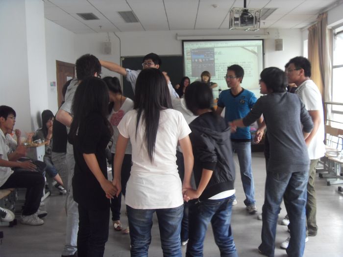 第一个活动是心有千千结。经过心理委员对规则的详细讲诉和ppt上面规则的展示,第一组同学来到场地中央,游戏按照规则展开。经过走乱后拉起手的同学编织了一张错综复杂的网,不过经过大家的齐心协力,他们花了40s解开了这乱结,一个不错的时间。不过第二组的同学有一个更出色的表现,他们的齐心仅用了10s活脱脱将结打开恢复原状。这不仅让他们为自己出色表现鼓掌。