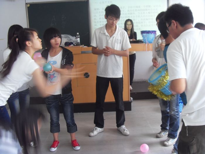 对场地经过一番装扮后,同学也陆续来到了这个约定地点。首先由心理委员陈述了今天班会的主题:齐心协力,同时讲述了此次班会的目的和对为来的希望。接着活动结合着主题展开。心理委员按照座位的摆放将同学分成了两组。