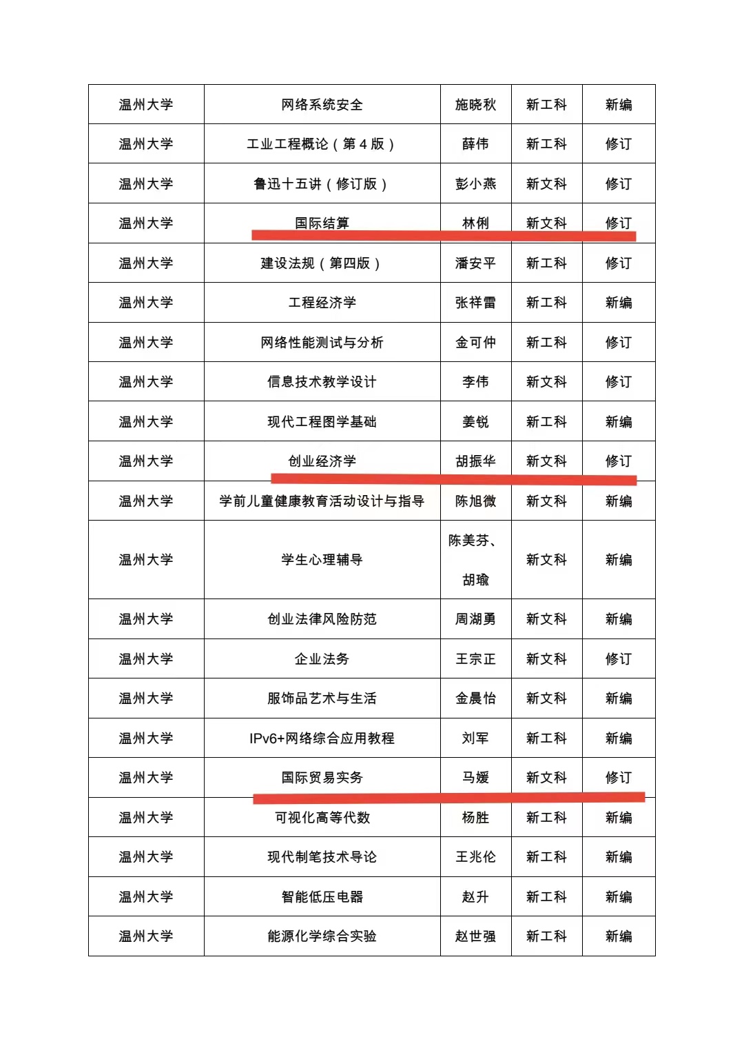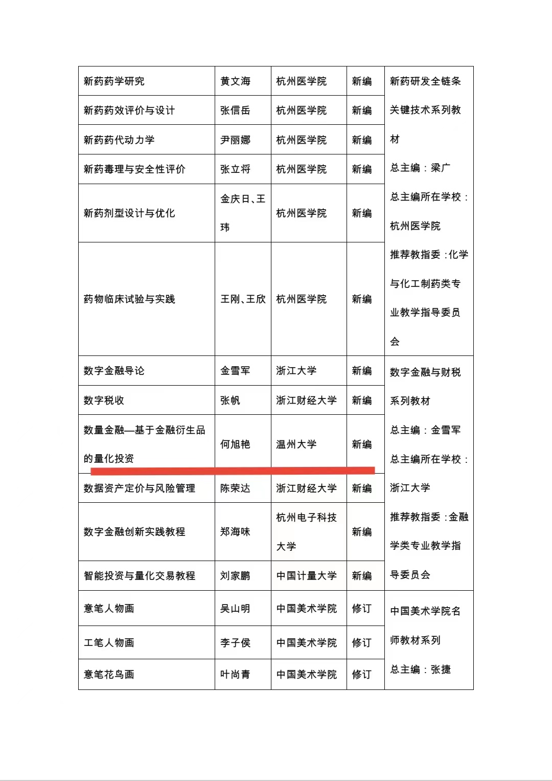 我院胡振华老师的《创业经济学》、林俐老师的《国际结算》、马媛老师的《国际贸易实务》和何旭艳老师的《数量金融—基于金融衍生品的量化投资》获得浙江省普通本科高校“十四五”首批新工科、新文科、新医科、新农科重点教材建设项目立项。