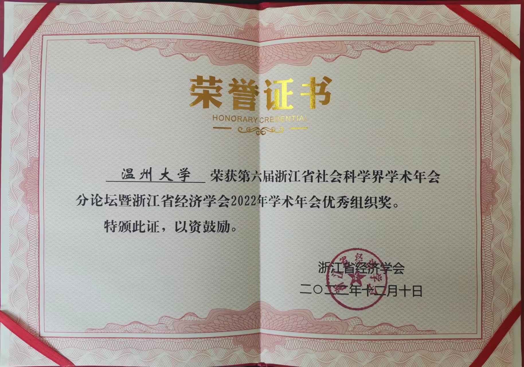 2022年12月,浙江省经济学会授予温州大学第六届浙江省社会科学界学术年会分论坛暨浙江省经济学会2022年学术年会优秀组织奖!